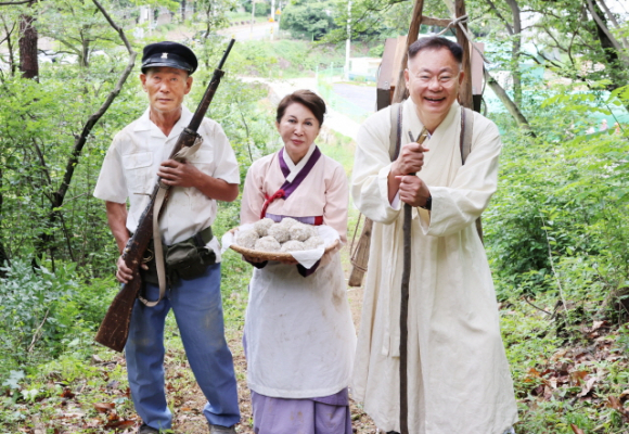 | ↑↑ 칠곡군은 지난 30일 망정리 328고지 지겟길에서 지게 부대 재현 행사를 개최하고 추모비 건립을 알렸다. 사진은 왼쪽으로 부터 망정1리 윤병규 이장, 백남희 여사, 김재욱 칠곡군수 |