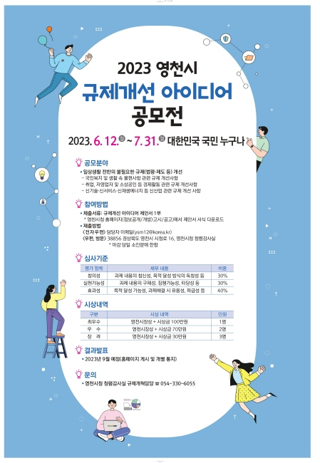 영천시(시장 최기문)는 시민 생활과 생업 현장에 숨어있는 불합리한 규제를 발굴하기 위해 12일부터 다음달 31일까지 ‘2023년 규제개선 아이디어 공모전’을 개최한다.