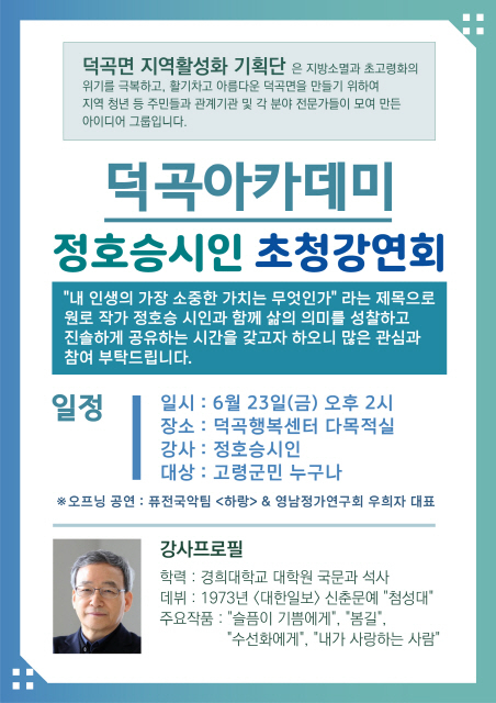고령군(군수 이남철) 덕곡면은 오는 6월 23일(금) 오후 2시 덕곡행복센터에서 ‘정호승 시인 초청강연회’를 개최한다.