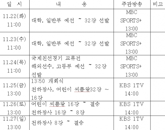 대한씨름협회가 주최하는 이번 대회는 2011년 씨름을 최종 평가하는 무대가 되어 분야별 최고의 선수가 참가하여 모래판을 달굴 것으로 보인다. 11월 22일부터 24일 경기는 11시에 시작하며 MBC SPORTS+에서 중계방송 할 예정이고, 25일부터 27일 경기는 오후 1시에 시작하며 KBS 1TV에서 중계방송 할 예정이다.