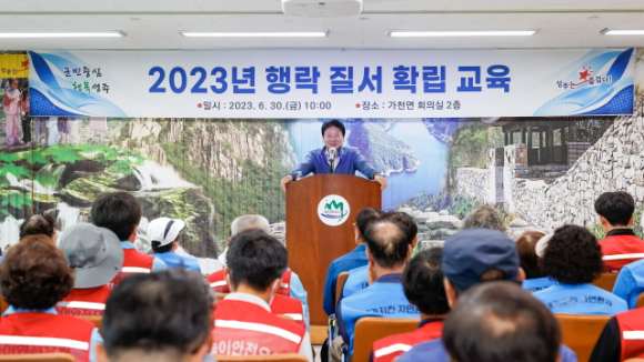 성주군은 본격적인 행락철을 맞이하여, 행락질서계도 및 건전한 여가 문화 정착을 위해 6월30일 10시, 가천면 행정복지센터 2층 대회의실에서 이병환 군수, 강만수 도의원, 구교강 군의원, 여노연 군의원이 참석한 가운데 70여 명의 행락질서 안내요원 및 물놀이 안전지킴이를 대상으로 행락 근무요령 및 친절 교육을 실시했다.