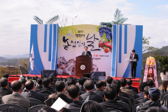 영천시는 한 해 동안 어려운 현실 속에서 구슬땀을 흘린 농업인들이 한자리에 모여 그 동안의 노고에 대하여 서로 격려하고 위로하기 위해 제 15회 농업인의 날 기념행사를 11일 영천시농업기술센터에서 농업인, 소비자, 농업관련 유관기관, 단체 등 750여 명이 참석한 가운데 2011 영천시 농업인의 날 행사를 개최했다.