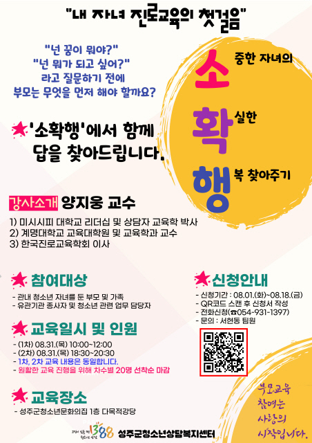 성주군청소년상담복지센터는 8.3.(목) 2회에 걸쳐 성주군청소년문화의집 1층 다목적강당에서 계명대학교 양지웅 교수와 함께 “내 자녀 진로교육의 첫걸음-소확행”이라는 주제로 부모교육을 실시한다.