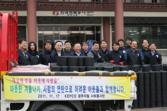 KEPCO 경주지점 사회봉사단(단장 박재덕) 및 전력노조 경주지회(위원장 정상호) 간부 노조원은 17일 연탄 한 장 마련하기 어려워 추위에 떠는 소외 주민들의 한겨울을 훈훈하게 하고 있다. 한전경주지점은 경주시로부터 추천을 받아 시내 독거노인 10세대에 대하여 “사랑의 연탄” 2000장을 직접 가가호호 방문하여 따뜻한 겨울을 보낼 수 있도록 “사랑의 연탄 나눔” 봉사활동을 펼쳤다.