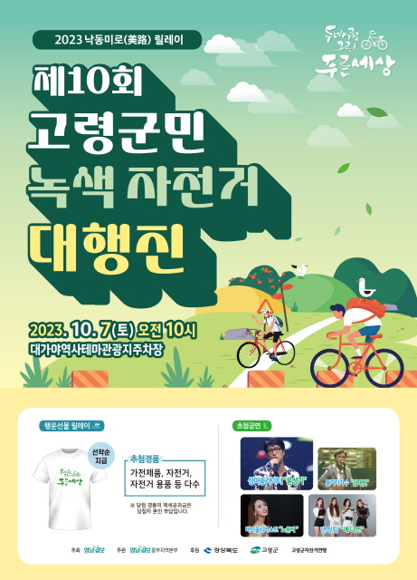 고령군(군수 이남철)에서는 오는 10월 7일 오전10시, 고령군 대가야읍 역사테마관광지 주차장 특별무대에서 ‘제10회 고령군민 녹색자전거 대행진’을 개최한다.