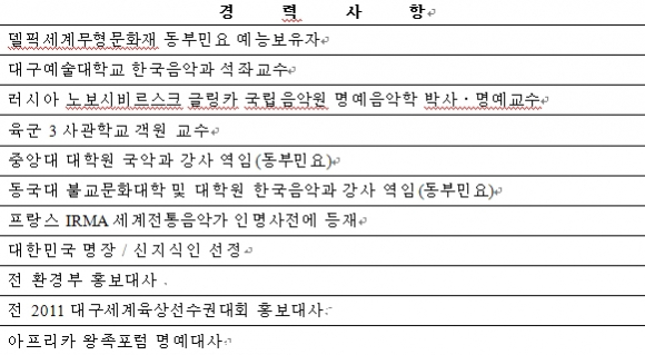 동부민요가 세계적으로 평가ㆍ인정되어, 2010년 6월 델픽 세계무형문화재 동부민요 예능보유자로 지정되었고, 동년 9월 리비아에서 아프리카 왕족포럼의 명예대사로 임명되었다.