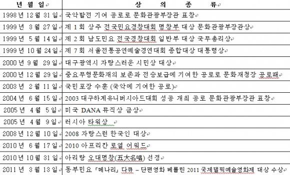 박수관 명창의 경력과 수상 내용 및 공적은 아래와 같다.