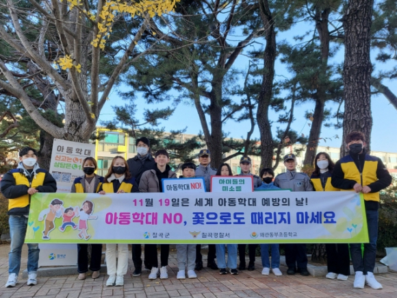 칠곡군은 지난 17일 '11월 19일 세계아동학대예방의 날'을 맞아 왜관동부초등학교에서 칠곡경찰서, 왜관동부초등학교와 함께 아동학대 근절과 아동 보호를 위한 캠페인을 펼쳤다.