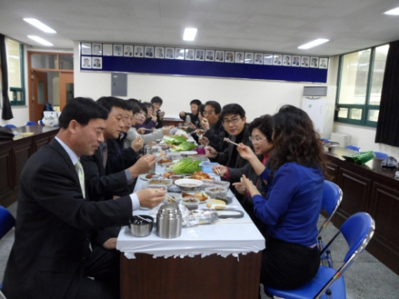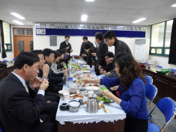 김장철이라 김장김치와 배추쌈 등이 주요 반찬이지만 “하하, 호호” 웃음 넘치는 점심시간이다. 대가면은 즐거운 직장분위기 조성과 친절마인드 함양을 위하여 부단히 노력하고 있으며 이를 위한 다양한 프로그램을 추진하고 있다.