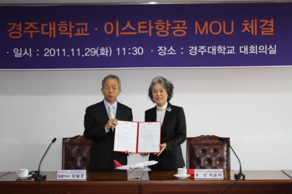 경주대학교와 이스타항공은 29일(화) 오전 11시30분 경주대학교 대회의실에서 이순자 총장 및 학교관계자와 이스타항공 대표이사 및 임직원들이 참석한 가운데 관광/항공산업 발전 및 전문인력 양성 공동노력을 내용으로 하는 산학협동 협약을 체결했다.