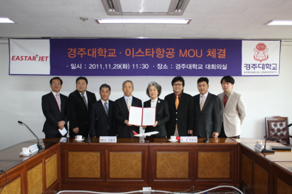 |  | | | ↑↑ MOU 체결 후 경주대학교 관계자들과 이스타 항공 관계자들이 기념촬영 | | ⓒ GBN 경북방송 | |