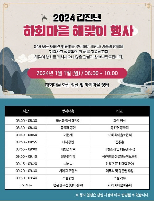 사단법인 안동하회마을보존회는 새해를 맞이하여 오는 1월 1일 『2024년 갑진년(甲辰年) 해맞이 행사』를 하회마을 화산(花山) 정상에서 개최한다.