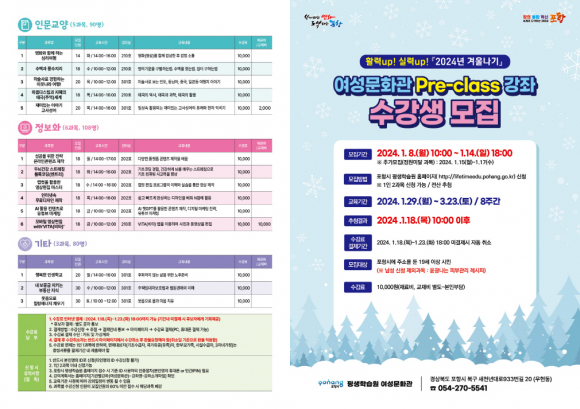 |  | | | ⓒ GBN 경북방송 | | 포항시 평생학습원 여성문화관은 오는 8일부터 14일까지 ‘2024년 겨울나기’ 강좌 수강생을 ㅂ모집한다.