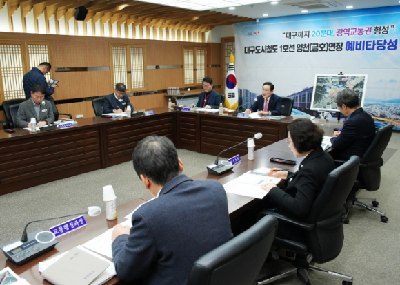 영천시(시장 최기문)는 5일 대구도시철도 1호선 금호 연장사업 기재부 예비타당성조사 최종 통과 후, 오후에 ‘예타 통과에 따른 시정 전략점검 회의’를 개최했다. 회의에는 최기문 시장을 비롯해 간부 공직자, 관련 부서장 등 약 30여 명이 모인 가운데 도시철도 예타통과 경과보고와 함께 주변 SOC사업, 연계대응사업에 대해 심도 있게 점검하고 전략방안을 공유했다. 영천시는 영천경마공원과 인근 산업단지 조성, 각종 광역교통망 확장 공사 등 도시철도 주변 SOC 사업들의 추진현황을 점검하고 개별 사업들 간 연계시너지 방안을 모색했다. 먼저, 대구-경산-영천 간 획기적으로 늘어날 유동인구를 바탕으로 2026년 영천경마공원의 성공적 개장을 추진하고, 경부선 금호대창 하이패스IC 설치 공사, 국도4호선 금호~하양 단구간 확장공사, 금호·대창 일반산업단지 등 기 추진 중인 역점사업들을 연계해 광역 교통망 확충과 기업 유치에 총력을 기울여 나갈 방침이다. 특히, 영천하이테크파크지구와 9km, 금호 일반산업단지와는 불과 3km 거리에 있어 알짜기업 유치와 일자리 창출에 더욱 유리해질 전망이다. 근로자들이 대중교통으로 출·퇴근이 가능해 유동인구와 정주인구도 크게 늘어날 것으로 기대된다. 이에 따라 신규 주거단지와 주변 상권 등 역세권 조성을 위한 용역 착수에도 심도 있게 논의했다. 아울러, 대구와 20분대 동일 생활권이 형성됨에 따라, 시민들이 더욱 편리하게 대도시권 문화를 향유할 수 있도록 대중교통 노선체계 개편 등 연계사업을 발굴해 도시철도 중심의 대중교통체계로 전면 개편하는 방안도 모색했다. 도시철도 개통으로 시정 최대 현안인 대구 군부대 영천 유치 활동은 더욱 탄력을 받게 된다. 군인과 군인 가족의 교통 편리성을 강점으로 내세워 유치 활동에 총력을 기울여 나갈 방침이다.