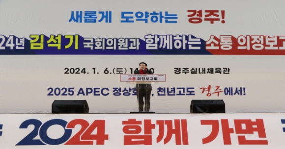 인사말에서 김석기 의원은 시민들을 향해 새해 큰절을 올리는 것으로 시작으로, “정부의 긴축재정에도 불구하고 경주 시민들의 뜨거운 성원으로 경주시장과 공무원 등 모두가 합심해서 값진 성과를 이뤘다.”라고 시민들에게 고마움을 표했다. 또 ‘2024년도 경주 예산안은 국비 8,877억 원, 도비 1,672억 원으로 전년도보다 446억 증가한 총 1조 549억 원의 국·도비를 확보’했다고 밝혀 시민들의 환호와 큰 박수를 받았다.