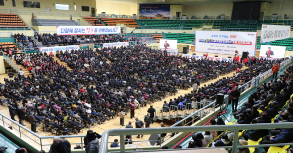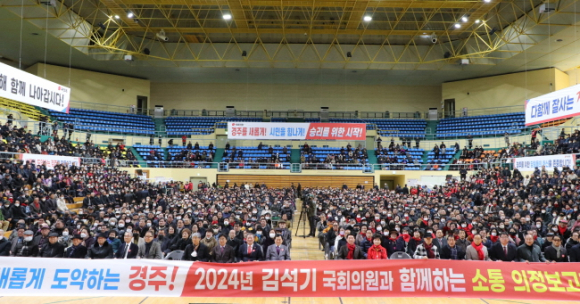 이날 경주실내체육관에서 열린 의정보고회에는 추운 날씨에도 불구하고 수많은 시민이 찾아와 인산인해를 이룬 가운데, 인파가 4,000여 석의 좌석을 가득 메워 후끈한 열기를 더했다.