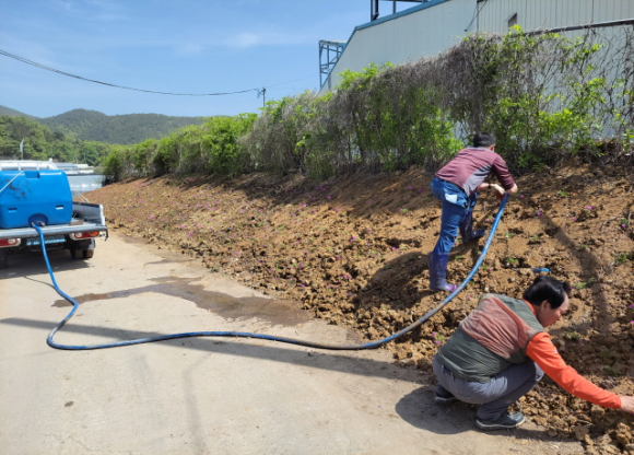 폐비닐·폐부직포 분리배출, 일반쓰레기 배출, 성토 및 꽃잔디 식재로 '깨끗한 농촌만들기' 농로 화단을 조성했으며 물주기, 비료주기, 제초관리로 꽃잔디가 잘 활착될 수 있도록 할 예정이다.