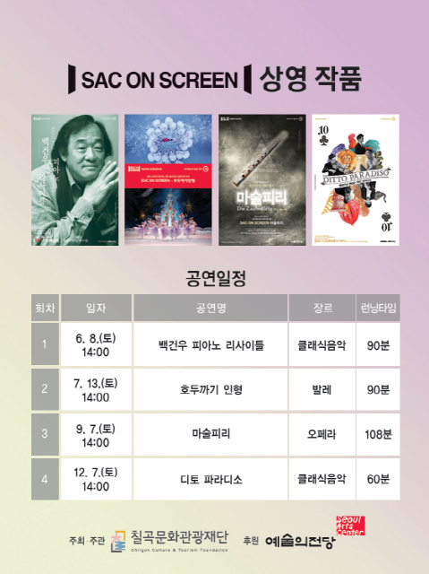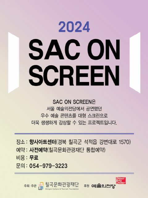 칠곡군 향사아트센터에서는 예술의 전당 우수 공연 콘텐츠를 공연장 대형 스크린으로 보여주는 ‘SAC ON SCREEN’을 무료로 진행한다.