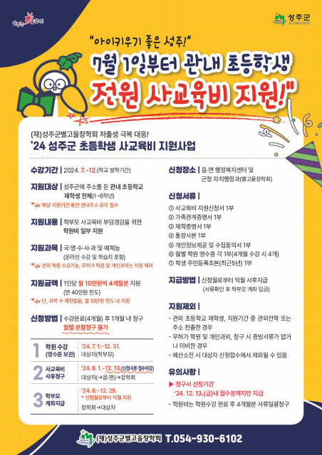 (재)성주군별고을장학회에서는 출생감소 및 학령아동 유출 등 범국가적 위기인 저출생 극복을 위해 『2024년 성주군 초등학생 사교육비 지원사업』을 오는 7월 1일부터 시작한다.