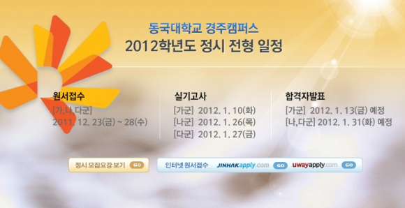 동국대학교 경주캠퍼스(총장 김영종)는 2012학년도 정시모집에서 가군 315명, 나군(한국음악과) 8명, 다군 366명 등 총 689명을 선발할 예정이다. 원서접수는 2011년 12월 23일(금)부터 28일(수)까지 인터넷으로 접수할 수 있으며, 특수교육대상자(4명)는 12월 23일(금) ~ 25일(일)까지 방문 접수 가능하다.