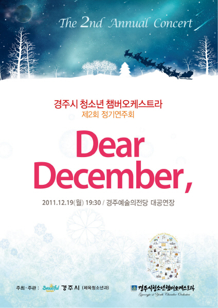 경주시 청소년 챔버오케스트라는 ‘Dear December(12월에게)’라는 주제로 또래 청소년들에게 꿈과 희망을 불어 넣어주고 또한, 지난 ‘9월 오사카 교민을 위한 연주회’의 경험을 바탕으로 내년 2012 한중수교 20주년 국가행사(예정)에서도 경주시를 알리는 선구자적 역할을 할 것으로 기대하고 있다. |