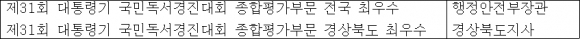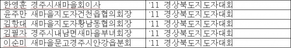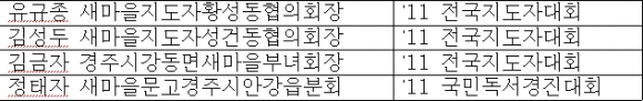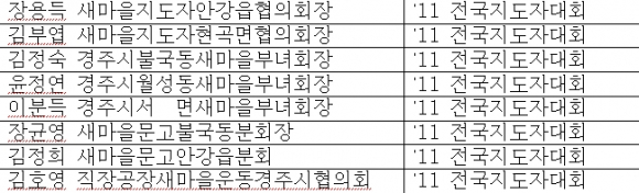▶ 종합평가 부문 : 최우수 - 내남면새마을 우 수 - 불국동새마을, 성건동새마을 장려상 - 황남동새마을, 안강읍새마을, 산내면새마을