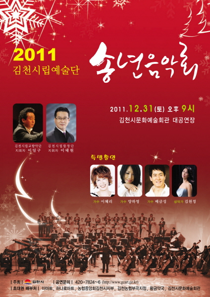 김천시에서는 오는 12월 31일 저녁9시 김천시문화예술회관 대공연장에서 한해를 마무리하는『2011 김천시립예술단 송년음악회』를 개최한다.
