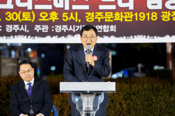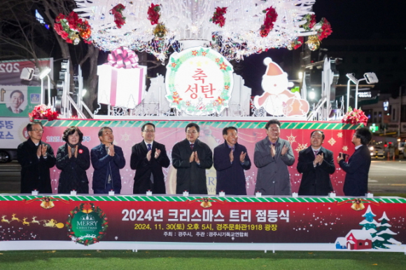 경주시가 경주문화관1918 광장에서 지난달 30일 희망과 화합의 불빛을 밝히는 성탄절 트리 점등식을 가졌다. 경주시기독교연합회의 주관으로 진행된 이날 점등식 행사에는 주낙영 시장, 김석기 국회의원, 이동협 시의회 의장을 비롯한 지역 기독교 관계자와 시민 등 200여 명이 참석했다. 이번 점등식은 오는 25일 성탄절을 기념해 종교적 의미를 떠나 한 해를 마무리하고 희망찬 새해를 맞이하고자 마련됐다. 트리는 높이 13m, 폭 6m 대형 조형물로 설치됐으며, 성탄절과 함께 연말연시 분위기를 물씬 느낄 수 있도록 조성했다. 이날 점등식을 가진 트리 불빛은 내년 1월 17일까지 광장을 아름답게 수놓을 예정이다.