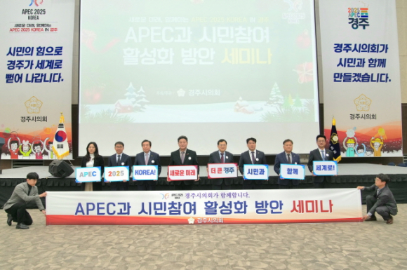 경주시의회(의장 이동협)는 19일 경주화백컨벤션센터(HICO)에서 2025 APEC 정상회의 성공개최를 위해 APEC 진행상황을 공유하고 시민의견을 수렴하기 위한 ‘APEC과 시민참여 활성화 방안 세미나’를 개최했다. 경주시의회가 역점적으로 주최·주관하여 개최한 이번 세미나는 경주시의회 의원들과 시민단체, 관심 있는 시민 등 200여 명이 참석했다. 이 날 세미나는 ▲ APEC 홍보영상 상영 ▲ 강연(APEC과 시민의 역할) ▲ 시민과의 소통토크 및 퀴즈 순으로 진행됐다. 이번 세미나는 APEC 분야의 전문가인 한국APEC학회 지역위원장과 동국대학교 WISE캠퍼스 평생교육원장 및 정보경영학과 교수를 맡고 있는 이영찬 교수가 강연을 맡아, APEC 정상회의 성공개최를 위한 시민의 역할과 중요성을 다루고 시민이 함께 준비하는 APEC을 위해 고민하는 시간을 가졌다. 강연에 이어 시민과의 소통토크 시간에서는 시민들과 질의응답과 퀴즈를 진행하는 등 활발한 참여를 이끌어 내 APEC 성공개최 준비를 위한 열띤 소통의 장을 펼쳤다. 이동협 경주시의회 의장은 “연말의 바쁜 일정에도 세미나에 참석해 주신 많은 시민분들께 진심으로 감사드린다.”면서 “이번 세미나가 2025 APEC 정상회의의 성공적인 개최를 위한 힘을 모으고, 경주가 새롭게 도약하는 계기가 되길 기대한다.”고 말했다. 이어 이락우 2025 APEC 정상회의 추진지원 특별위원장은 “이번 세미나는 의회에서 역점적으로 주최한 행사로, 이를 통해 경주 미래를 위해 새로운 대안과 정책이 만들어지길 희망한다.”며 “앞으로도 시민과 함께 협력하여 APEC 정상회의를 성공적으로 준비해 나가겠다.”고 밝혔다.