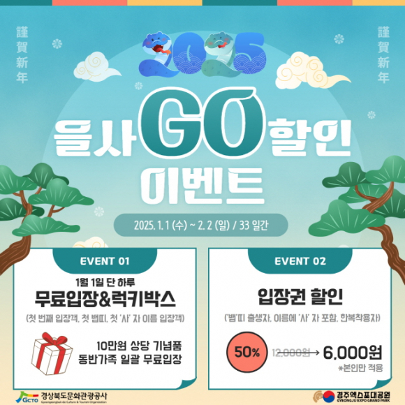 2025년 을사년(乙巳年) 새해, 경주엑스포대공원에서 ‘을사 GO’ 이벤트로 특별한 행운을 만나보세요! 경북문화관광공사(사장 김남일, 이하 공사)는 을사년 새해를 맞아 경주엑스포대공원을 찾는 입장객을 대상으로 특별한 혜택을 제공하는 ‘을사 GO’ 이벤트를 개최한다고 밝혔다. ‘을사 GO’ 이벤트는 1월 1일 경주엑스포대공원을 방문하는 입장객 중에서 특별한 행운을 선물하는 방식으로 진행된다. 대상은 첫 입장객, 첫 ‘뱀띠’ 입장객, 이름에 ‘사’가 포함된 입장객 등 총 3명에게 무료입장 혜택과 함께, 10만원 상당의 럭키박스가 증정된다. 또한, 당첨자의 동반 가족도 무료입장을 추가 혜택을 누릴 수 있다. 첫 입장을 놓쳤더라도 걱정하지 말자! 1월 1일부터 2월 2일까지 진행되는 행사 전 기간 동안, 뱀띠 입장객, 이름에 ‘사’자가 포함된 입장객, 한복을 착용한 입장객에게는 본인에 한해 입장요금 50% 할인 혜택(6,000원)을 제공한다. 또한, 경주엑스포대공원은 사적지 할인, 숙박 할인, 세금 포인트 할인, 헌혈증 기부자 무료입장 등의 다양한 혜택도 추가로 제공한다. 경주엑스포대공원을 방문할 계획이라면 홈페이지나 안내를 통해 할인 혜택을 꼭 확인하는 것이 좋다. 김남일 사장은 “을사년 새해를 맞아 경주엑스포대공원을 찾는 모든 입장객들이 특별한 행운을 경험하고, APEC 성공 개최를 기원하는 마음으로 이번 이벤트를 준비했다”며, “경주엑스포대공원을 방문하는 모든 분들이 활기차고 희망 가득한 한 해를 시작하시길 바란다“고 전했다.