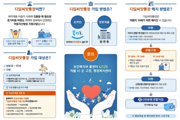 디딤씨앗통장 신청은 거주지 읍·면·동 행정복지센터를 방문하거나 ‘복지로’ 홈페이지(www.bokjiro.go.kr)에서 온라인 신청도 가능하다.