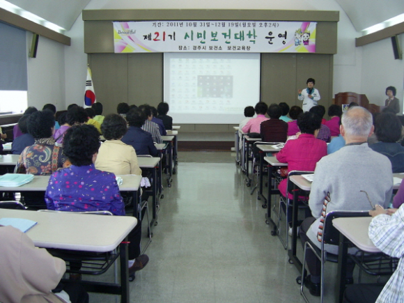 경주시 보건소는 지난 한해 시민보건대학으로 시민들의 인기를 받았다. 2011년 12월 19일 보건교육장에서 수료생 74여명이 참석한 가운데 제21기 시민보건대학 수료식을 가진 한편, 올 한해도 22기 시민보건대학을 개최해 시민들에게 건강에 대한 기본 지식을 제공하고, 생활 습관 개선에 앞장서나갈 계획이다.