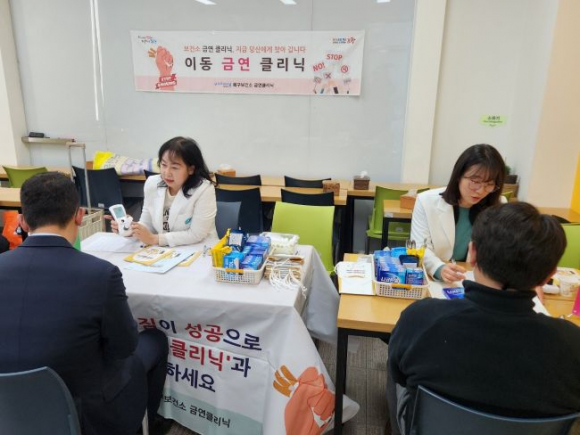 이동금연클리닉은 보건소 방문이 어려운 흡연자 10명 이상인 사업장이나 기관을 금연 상담사가 직접 찾아가는 서비스로 6주간 주1회 사업장을 방문해 기초 건강조사 및 1:1 맞춤 금연 상담으로 개인에 맞는 행동요법, 금연보조제를 지원하는 것으로 6개월 금연 성공자에게는 소정의 상품도 지급하는 프로그램이다.