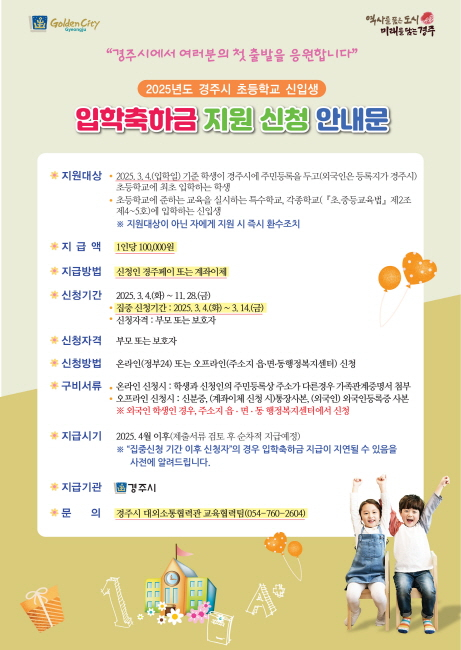 경주시가 올해도 초등학교 입학축하금과 중‧고등학교 신입생의 교복 구입비를 지원한다고 26일 밝혔다. 입학축하금은 입학일인 3월 4일 기준 경주에 주소를 둔 초등학교 신입생에게 10만 원을 지원한다. 교복구입비는 3월 4일 기준 부모 또는 학생이 경주에 주소를 둔 중·고등학교 신입생에게 30만 원을 지원한다. 초등학교 입학축하금은 3월 4일부터 온라인(정부24) 또는 주소지 행정복지센터를 방문해 신청하면 된다. 외국인 학생의 경우에는 주소지 행정복지센터에서만 신청 가능하다. 중‧고생 교복구입비는 3월 4일부터 온라인(정부24) 또는 재학 중인 학교를 통해 신청하면 된다. 단, 경주에 주소를 두고 다른 지역 학교에 입학하는 중‧고 신입생의 경우는 온라인(정부24) 또는 주소지 행정복지센터로 신청하면 된다. 시는 원활한 지원을 위해 입학축하금은 3월 4~14일, 교복구입비 3월 4~31일까지 온‧오프라인 집중 접수 기간을 운영한다. 이 기간 동안 신청을 하면 보다 빨리 지원을 받을 수 있으며, 지급은 서류 검토 후 4월 말부터 순차적으로 지원된다. 자세한 내용은 경주시청 홈페이지를 참고하거나 경주시 대외소통협력관(054-760-2604, 2612)으로 문의하면 된다.