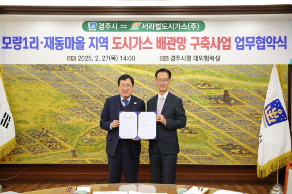 경주 건천 모량1리와 선도 재동마을에 올 연말 도시가스가 보급될 전망이다. 경주시와 서라벌도시가스㈜는 27일 시청 대외협력실에서 ‘모량1리‧재동마을 도시가스 배관망 구축사업 업무협약’을 체결했다. 업무협약식에는 주낙영 시장, 김준석 서라벌도시가스㈜ 대표, 박승직 도의원, 박광호 시의원, 주민대표 등 10명이 참석했다. 향후 두 기관은 사업비 31억 9500만원(도‧시 65%, 서라벌 35%)을 들여 올 12월까지 134세대를 대상으로 도시가스 배관망을 구축한다. 도시가스배관은 △모량1리(본관 0.82㎞, 공급관 3.5㎞) △재동마을(공급관 3㎞)에 총 7.32㎞로 매설된다. 이번 업무협약에 따라 시는 각종 인허가를 지원, 서라벌도시가스㈜는 도시가스 배관망 구축사업 시공 총괄과 배관 및 정압기 관리를 담당한다. 두 기관은 다음 달부터 해당 읍면동 행정복지센터에서 주민설명회를 시작으로 같은 달 공사를 착수해 올 연말까지 사업을 마무리할 계획이다. 시는 이번 사업을 통해 주민들의 연료비 부담을 경감하고 에너지 분야 정주 여건을 개선하는 데 큰 도움이 될 것으로 기대한다. 주낙영 경주시장은 “에너지 복지혜택에서 소외된 지역민 모두 연료비 부담 경감은 물론 안전하고 편리하게 이용할 수 있도록 행정력을 집중할 계획이다”라며 “사업 기간 중 안전하고 완벽한 시공에 최선을 다 하겠다”고 전했다.