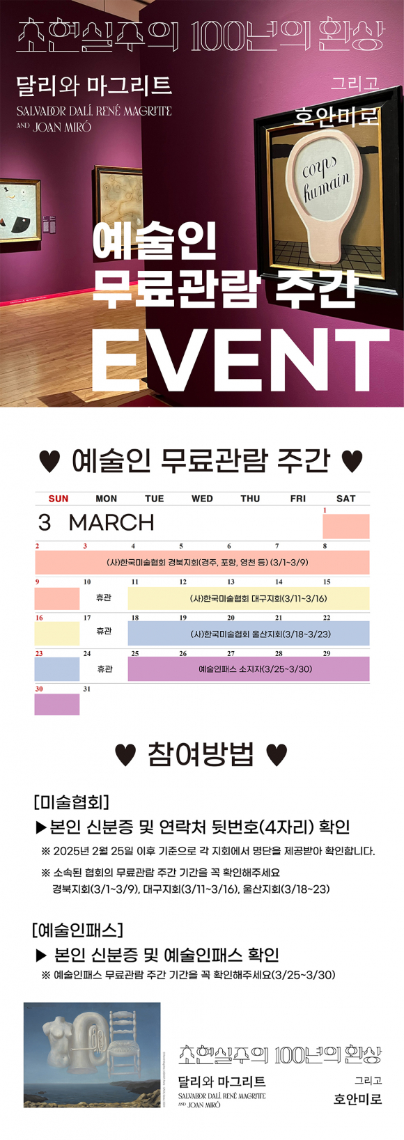 재단법인 경주문화재단(이사장 주낙영)은 지역 예술인의 창작 의욕 고취와 문화 향유 기회 확대를 위해 한수원아트페스티벌 〈달리와 마그리트 그리고 호안미로; 초현실주의, 100년의 환상〉의 ‘예술인 무료 관람 주간’행사를 진행한다. 예술인 무료관람 주간으로 경주예술의전당 인근 지역의 예술인들은 전시를 무료로 관람할 수 있다. 첫째 주(3/1~3/9)에는 경북미술협회, 둘째 주(3/4~3/9)에는 대구미술협회, 셋째 주(3/11~3/16)에는 울산미술협회, 그리고 마지막 주(3/18~3/30)에는 예술인패스 소지자가 무료 관람 혜택을 받는다. 미술협회회원은 미술관 현장에서 신분증과 명단, 예술인패스 소지자는 신분증과 예술인패스(실물, 모바일)를 확인한 뒤 입장 가능하다. 미술관에서는 초현실주의 거장(살바도르 달리, 르네 마그리트, 막스 에른스트, 호안미로, 알베르토 자코메티 등)들의 주요 원화 작품 관람뿐만 아니라 시민도슨트 등 다양한 이벤트에 참여하면 전시 굿즈도 증정하고 있다. 〈달리와 마그리트 그리고 호안미로; 초현실주의, 100년의 환상〉은 스코틀랜드 국립미술관 소장품으로 초현실주의 거장 살바도르 달리, 르네 마그리트, 막스 에른스트, 호안 미로, 마르셀 뒤샹, 알베르토 자코메티 등 초현실주의 미술을 대표하는 작가들의 주요 작품과 아카이브 자료 100여 점을 선보이는 대형 전시이다.