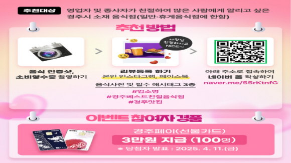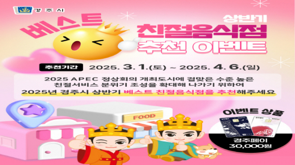 경주시가 다음 달 6일까지 추천을 받아 올 상반기 베스트 친절음식점 10곳 선정에 나선다. 경주지역 음식점을 찾는 관광객이나 방문객 누구나 참여 가능하다. 이벤트 참여자에게는 무작위 추첨 방식으로 100명을 선정해 3만 원권 경주페이(충전식 카드형)를 지급한다. 참여 방법은 경주지역 일반·휴게음식점을 방문해 식사 후 음식사진과 영수증을 사진 촬영해 본인 인스타그램이나 페이스북에 음식사진 및 필수 해시태그 3종 리뷰를 등록하면 된다. 이후 네이버 폼을 작성하면 참여 인증이 완료된다. 시는 1차 추천된 음식점을 대상으로 서면 심사를 거쳐 2차 현지 심사를 진행한다. 현지 심사에서는 △맞이/배웅태도 △응대서비스 수준 △고객편의시설 △위생관리 △체감 만족도 등 6개 분야 13개 항목에 대해 평가한다. 여기에 위생 등급제, 모범·아동친화음식점, 안심식당 참여 여부 및 상위 추천업소에 가점을 부여한다. 선정된 친절음식점은 표창패 수여와 각종 위생용품 등을 우선 지원하고 SNS 등을 통해 홍보할 예정이다. 한편 2025년 베스트 친절음식점은 상·하반기 각 10곳씩, 총 20곳을 선정한다. 하반기 베스트 친절음식점 선정은 8~11월까지 추천·심사해 선정할 예정이다.