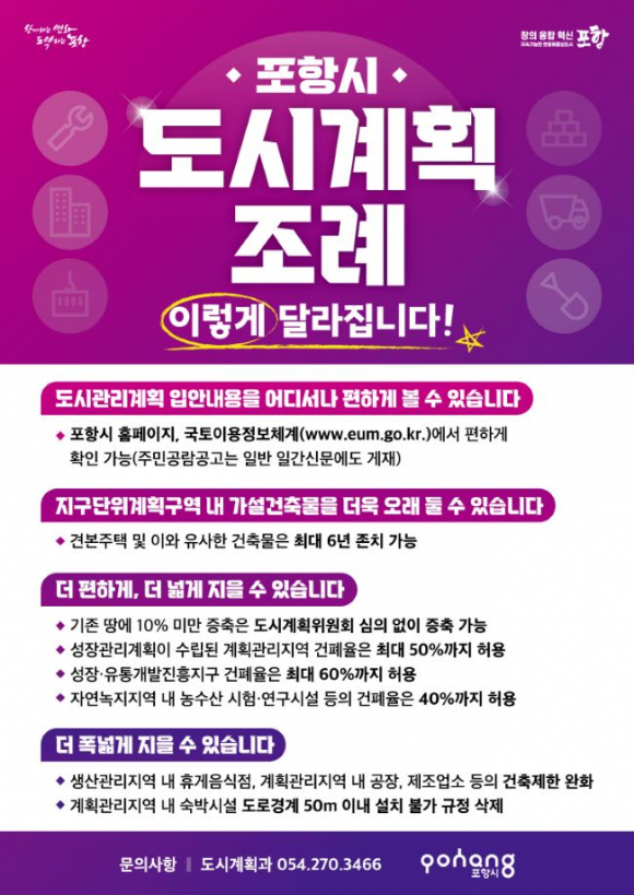포항시는 ‘포항시 도시계획 조례’ 일부개정 조례를 지난달 26일 공포했다고 밝혔다.