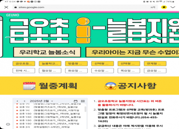 경북교육청(교육감 임종식)은 희망하는 학교에 ‘온라인 늘봄지원실’을 개설할 수 있도록 지원하겠다고 21일 밝혔다. 경북교육청은 2025년부터 늘봄학교 운영 대상을 초등학교 2학년까지 확대하며, 도내 466개 초등학교와 8개 특수학교에서 늘봄학교를 운영하고 있다. 늘봄학교는 기존 방과후학교와 초등돌봄교실을 통합해, 정규수업 외 시간에 초등학생의 성장과 발달을 위해 지역사회의 다양한 교육과 돌봄 자원을 연계한 종합 교육 프로그램을 운영하는 체제이다. 특히, 늘봄학교는 저학년 맞춤형 프로그램, 선택형 돌봄 프로그램, 선택형 교육 프로그램 등 학생 개개인의 상황에 맞게 프로그램을 선택할 수 있어 희망하는 초등학생 누구나 이용할 수 있다. 구미 금오초등학교는 학기 초 1, 2학년 학생들의 늘봄 프로그램별(요일별) 시간표를 몰라 학부모들의 문의가 많은 점에 착안해 온라인 늘봄지원실(i-늘봄지원실)을 개설하여 운영하고 있다. 온라인 늘봄지원실(i-늘봄지원실)은 늘봄학교 프로그램별 시간표와 요일별 시간표, 그리고 학생이 수강하고 있는 선택형 교육 프로그램의 활동과 현황을 온라인으로 확인할 수 있도록 지원하고 있다. 또, 여러 가지 늘봄 프로그램을 소개하고 늘봄학교 공지 사항과 Q&A를 운영해 학생과 학부모, 강사들과 온라인으로 소통할 수 있는 창구를 마련해 늘봄학교에 대한 학부모들의 궁금증이나 불편을 크게 줄여줄 것으로 기대된다. 경북교육청은 금오초의 온라인 늘봄지원실 운영이 학부모들에게 많은 도움이 된다고 보고, 다른 학교에서도 개설을 희망하면 적극 지원할 방침이다.