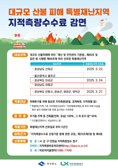 경북도는 지난 산불 발생으로 특별재난지역 선포 된 의성, 안동, 청송, 영양, 영덕 지역민들의 경제적 부담 경감과 신속한 피해복구를 위해 국토교통부에 지적측량수수료 감면을 요청해 감면 결정을 얻어냈다.