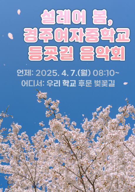 경주여자중학교(교장 민훈)는 2025년 4월 7일 오전 8시부터 30분간 교내 벚꽃나무 아래 등굣길에서 학생들을 대상으로 하는 ‘설레어 봄, 등굣길 음악회’를 개최했다. 이번 행사는 경주여자중학교 오케스트라 단원들이 직접 연주하는 클래식 음악과 함께 아침을 시작함으로써 학생들에게 새 학년의 긴장감을 완화하고 행복한 정서를 함양하며, 창의성 증진에 도움을 주고자 기획되었다. 또한 벚꽃이 만개한 교정에서 열리는 만큼, 학생들이 자연 속에서 예술을 즐길 수 있는 좋은 기회가 되었을 것으로 보인다. 오케스트라 악장 김○○(3학년) 학생은“많은 친구와 선생님들에게 즐거운 등굣길을 선물할 수 있어서 너무 기뻤고, 음악적으로 많이 성장했음을 느낄 수 있어서 뿌듯한 시간이었다”고 소감을 말했다.