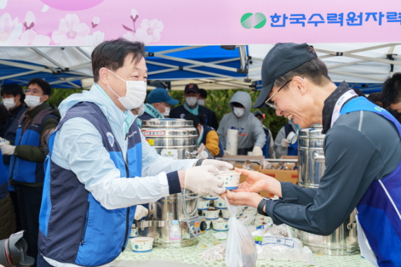 한국수력원자력(주) 월성원자력본부(본부장 정원호)는 4월 5일(토) 경주시 보문관광단지에서 열린 제32회 경주벚꽃마라톤대회에서 참가자와 관광객들을 대상으로 잔치국수 일만오천그릇 나눔 봉사활동을 시행했다. 이날 행사는 전국 각지에서 몰린 마라톤 참가자 약 15,000명이 참가해 성황을 이루었다. 한수원(주) 전대욱 경영부사장, 정원호 월성원자력본부장을 비롯한 본사·월성본부 직원 및 가족 80여명이 참여해 잔치국수 일만오천그릇을 직접 말며 정성을 나누었다. 월성원자력본부가 2007년 대회부터 시행한 잔치국수 무료나눔 행사는 이제 경주벚꽃마라톤대회에서 빼놓을 수 없는 명물로 자리매김했다. 배식시간 전부터 많은 사람들이 몰려들었으며, 특히 코스별 참가자들이 완주한 시간대에는 금세 몰려든 참가자들로 ‘대박국수집’의 풍경이 연출되었다. 선수들은 완주의 성취감을 안고 잔치국수 배식대를 찾아 따뜻한 국수 한 그릇과 함께 원기를 회복했다. 참가자들은 “역시 벚꽃마라톤대회 최고의 먹거리는 월성원자력본부의 잔치국수”라며 칭찬을 아끼지 않았고, 한 참가자는 “이 잔치국수 먹기 위해 매년 경주벚꽃마라톤대회에 참가하고 있다”고 말하기도 했다.
