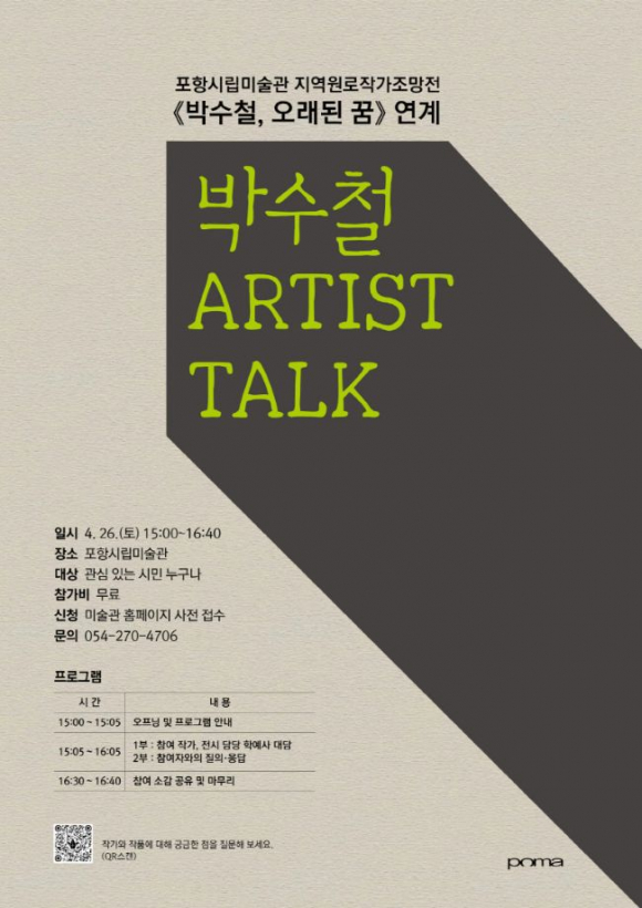 이번 아티스트 토크는 박수철 작가와 김한아 학예연구사의 대담 형식으로 진행되며, 전시의 기획 의도와 작품 속에 담긴 철학, 포항의 이미지, 지역의 역사와 예술적 가치 등에 대한 다양한 이야기가 오갈 예정이다.