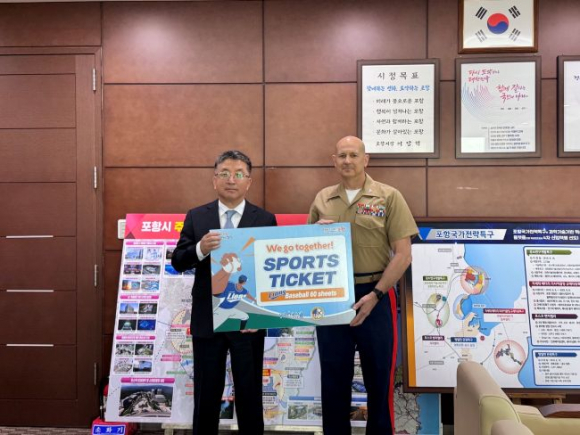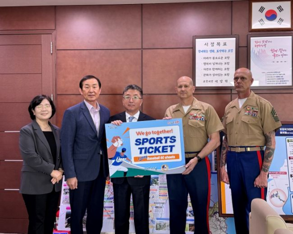 포항시는 21일 시청에서 주한 미 해병대 캠프무적(부대장 로니 D. 마이클) 소속 장병들을 위해 프로야구 관람권 60매를 전달했다.