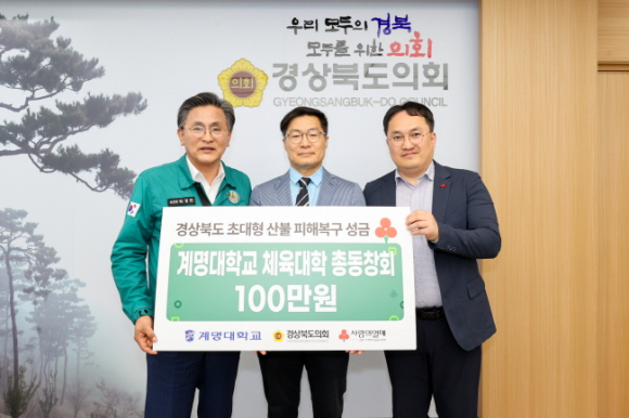 경상북도의회(의장 박성만)는 4월 21일(월) 경상북도의회를 방문한 계명대학교 체육대학 총동창회(회장 박성수)로부터 산불 피해 복구 성금 100만 원을 기탁받아 경북사회복지공동모금회에 전달했다. |