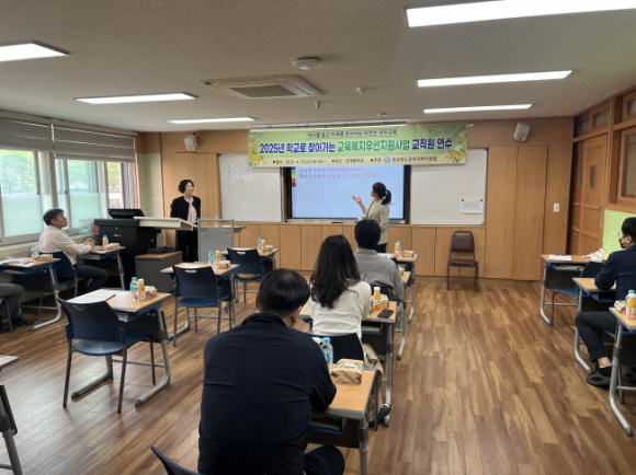 경주교육지원청(교육장 황영애)는 4월 11일 용강초등학교를 시작으로 동천초등학교, 모계중까지 4월 23일까지 교직원을 대상으로 교육복지우선지원사업 이해와 전문성 함양을 위한「2025년 학교로 찾아가는 교육복지우선지원사업 교직원 연수」를 실시하였다. 이번 연수는 관내 사업학교 2교를 비롯하여 연계교육지원청인 청도교육지원청 소속 연합형 사업학교인 모계중학교까지 대상으로 “1부: 교육복지우선지원사업 및 학생맞춤통합지원의 이해”, “2부: 효과적인 사례관리를 위한 실제사례 중심으로”라는 주제로 진행하였으며, 용강초등학교 연수는 고신대학교 주석진교수, 동천초등학교, 모계중학교(청도)는 진교육복지연구소 진미경 소장이 맡아주셨다.