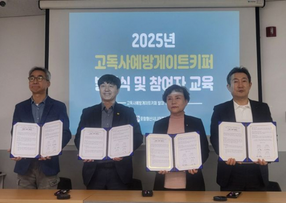 | ↑↑ 종합사회복지관 3개소(포항·학산·창포)가 포항형산시니어클럽과 손잡고 고독사 예방과 노인일자리를 연계한 ‘고독사 예방 게이트키퍼 시범 사업’ 업무협약을 포항형산시니어클럽에서 9일 체결했다. 왼쪽부터 이화천 포항형산시니어클럽 관장, 황영중 창포종합사회복지관장, 이계영 포항종합사회복지관장, 이형 학산종합사회복지관장. |