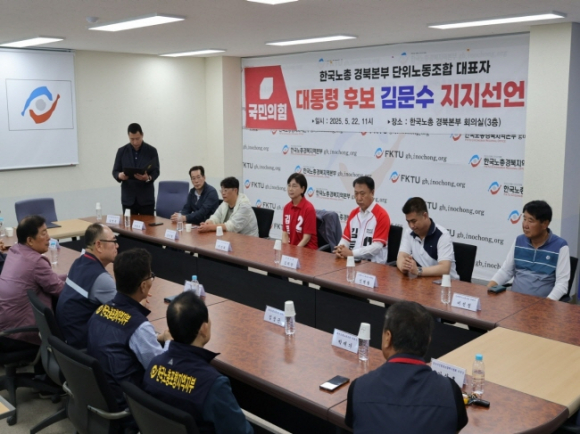 한국노총 경북본부 산하 단위노동조합 대표자들이 5월 22일 오전 11시 경북본부 회의실에서 국민의힘 김문수 대통령 후보에 대한 지지를 공식 선언했다. 이들은 “노동 중심의 대한민국”을 위해 김 후보와 끝까지 함께 하겠다는 입장을 밝혔다. 지지 입장문에서 대표자들은 “김문수 후보는 노동자이며 노동조합 위원장 출신으로, 노동의 고단함과 노동조합의 현실을 누구보다 잘 알고 있는 인물”이라며 “대한민국의 총체적 위기를 극복하고 사회통합과 균형발전을 실현할 책임 있는 지도자”라고 평가했다. 이어 “노동이 존중받고 공정한 사회를 만드는 것은 우리 노동자들에게 주어진 역사적 책무”라며 “김문수 후보와 함께 정의로운 사회 대전환을 반드시 실현하겠다고 밝혔다. 또한 “국민의힘과 김 후보의 대선 승리를 위해 전 조직적 역량을 집중할 것”이라고 강조했다. 한편 한국노동조합총연맹(한노총) 김동명 위원장이 더불어민주당 이재명 대선후보 선거대책위원회에 합류한 반면, 한국노총 경북본부가 국민의힘 김문수 후보를 지지하고 나선 것은 경상북도의회 이선희 기획경제위원회 위원장의 역할이 큰 것으로 알려졌다.