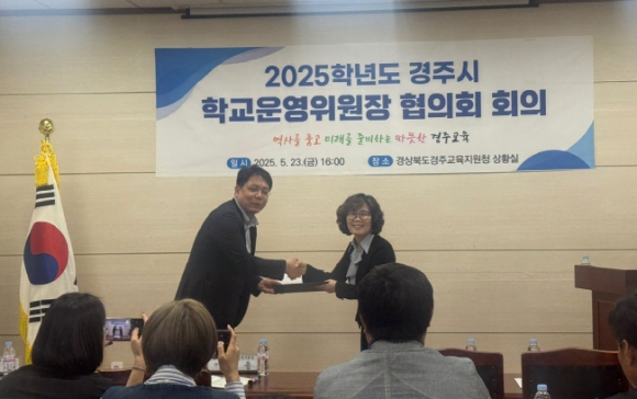 경주교육지원청(교육장 황영애)은 23일(금) 경주교육지원청 2층 상황실에서 2025학년도 경주시 학교운영위원장협의회(회장 이상용) 임원 회의를 개최했다. 이날 임원 회의에 앞서 교육장은 협의회장에 당선된 이상용 위원장에게 당선증을 수여하였으며, 이후 협의회장은 임원들에게 위촉장을 수여하였고, 임원진들은 학교운영위원회 활성화를 통하여 경주교육 발전에 이바지하겠다고 다짐하였다. 임원회의 축사를 통해 황영애 교육장은 “봄에 피어난 새싹이 무럭무럭 자라듯이 우리 아이들이 지적으로 정서적으로 성장하도록 교육지원청과 학교 운영위원장 협의회 임원들이 힘을 모아 잘 성장하도록 돕자”라고 말했다. 이상용 협의회장은 “학교운영위원회 협의회 회장으로 막대한 책임감을 느낀다. 학교는 지역의 중심이며, 학생은 우리의 미래다. 저는 앞으로 학교 운영위원회 간의 협력을 강화하고, 교육 현장의 목소리가 제대로 반영될 수 있도록 소통의 가교 역할을 충실히 하겠다.”라고 밝혔다.