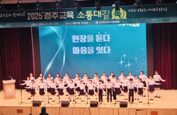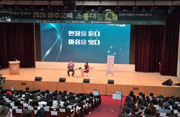 경상북도경주교육지원청(교육장 황영애)은 6월 5일(목) 경주화랑 마을 기파랑관에서 경상북도의회 의원, 관내 유․초․중․고등학교․ 특수학교 교(원)장, 학교운영위원 및 학부모회, 경주미래교육지구 관계자, 녹색어머니회, 학생상담자원봉사자회, 본청 주민참여예산 위원, 주민감사관, 미래교육모니터단, 교육계 원로 등 260여 명을 초청하여‘2025 경주교육 소통대길 톡’을 개최하였다. ‘소통대길 톡’은 기존의‘현장소통토론회’에서 명칭과 형식이 개편되어 교육 주요 시책과 사업 추진 현황을 교육공동체와 공유하며, 디지털 기반 참여형으로 다양한 현장 의견을 수렴하여 교육 시책에 반영하고 교육공동체와의 소통을 강화하고자 추진되었다. 행사는 ◦황남초등학교 합창단의 식전 공연 ◦경주교육지원청 교 육장의 학교 지원, 업무 경감, 교육환경 개선 등 주요 실적 보고 ◦ 교육감 인사 말씀 및 시낭송 ◦교육감과 대화의 시간(이슈톡, 고민종식 톡, 마무리) 순으로 진행되었다. ‘이슈 톡’시간에는 교원, 학생, 학부모 대표의 영상으로 지역교육 이슈를 듣고 교육감이 진로교육, 늘봄학교, 폐교 자원 활용 및 학부모 교육 등에 대한 주요 교육 현안들에 대해 답변하였다. ‘고민종식 톡’시간에는 디지털 도구(패들렛)를 활용해 현장에서 질문을 제시하면 교육감의 직접 응답이 이어져 현장의 진솔한 분위기를 더했다. 마지막 순서는 실시간으로 제시된 질문을 AI가 주요 키워드를 추출하여 추출된 키워드를 바탕으로 교육감이 마무리 발언을 하였다.